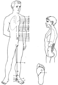 Böbrek meridyeni (R) – meridyenlerin Yin sistemine atıfta bulunur, su elementini ifade eder. Meridyendeki enerjinin yönü merkezcildir. Mesane meridyeninden enerji alır ve onu perikard meridyenine aktarır, ayak parmağı 27 noktya sahiptir. Maksimum aktivite süresi 17 ila 19 saatler, minimum meridyen aktivitesi süresi 5 ila 7 saater arasıdır.