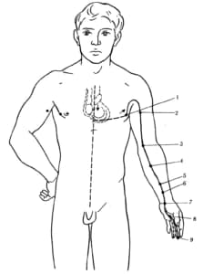 Meridyen dördüncü interkostal bölgede başlar, üçüncü interkostal bölgeye doğru yükselir, omuza doğru yürür, omzun iç kısmının ortasından geçer, dirsek ekleminden geçer, daha sonra önkolun iç kısmından avucunuzun ortasına doğru hareket eder (lao-gong noktası) ve orta parmağın ucunda biter.